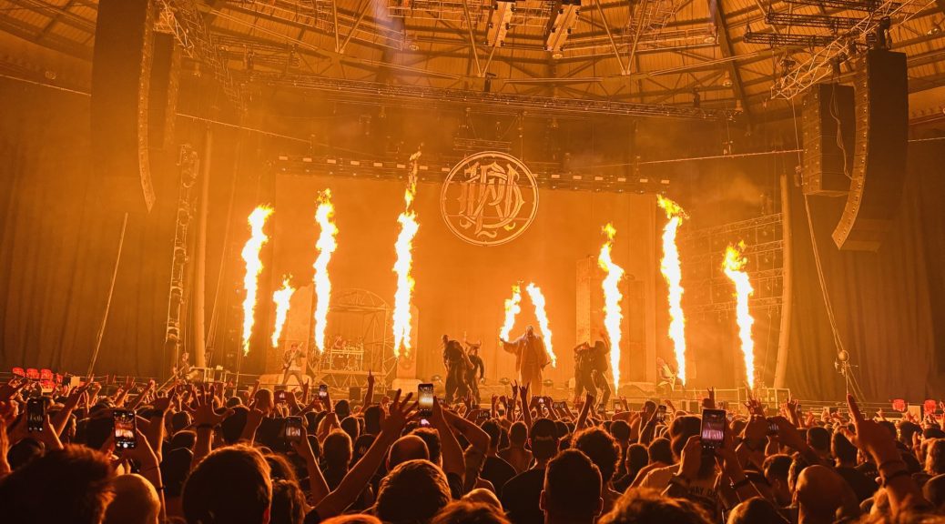 The main event took us a bit by surprise when the band members of Parkway Drive did not enter on the stage, choosing rather to arrive by the side entrance and parade through the standing area where we watched agape. Parenthesed by a flag-bearer before and after, the band members strode across the floor and took to the stage to blast into ‘Carrion’ as the audience was still processing the so-close-you-could-touch-them entrance.